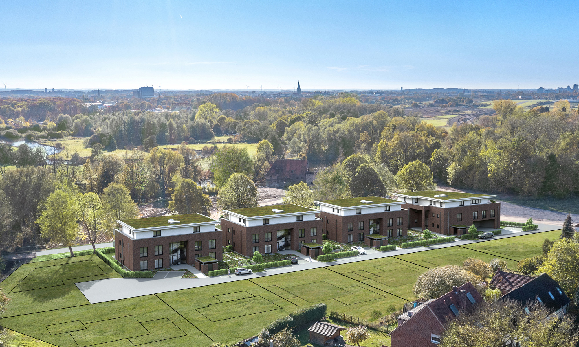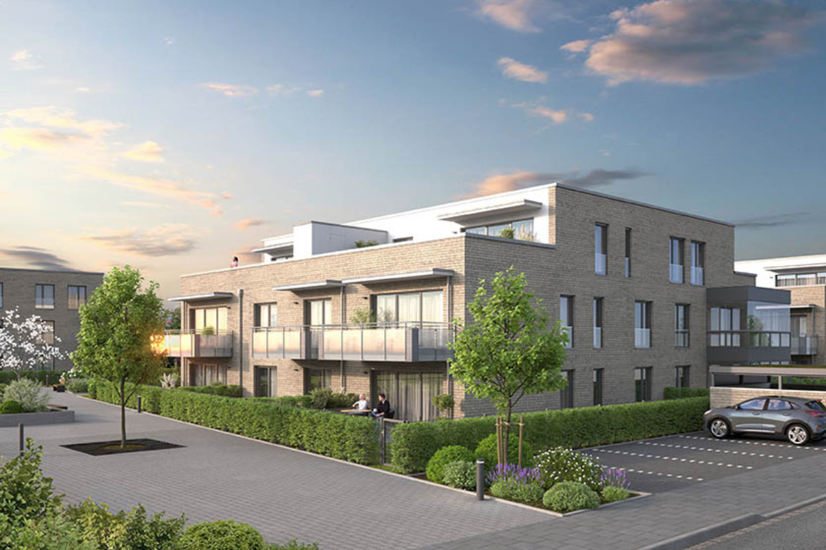 Die Mehrfamilienhäuser von Heckmann entstehen nach KfW 55, jenem Standard, der zum Zeitpunkt der Baugenehmigung up to date war. „Die Häuser sind aber nach energetischen Standards absolut top“, versichert Venker. Neben der Dachbegrünung nennt er die Tiefgaragen als Beispiel. Dort wurde für jeden Stellplatz die Infrastruktur für E-Mobilität vorbereitet, sodass die Nutzer entweder jetzt direkt oder später einmal eine Ladestation installieren können. Für die einzelnen Häuser steuert ein intelligentes Lade-Management-System das Aufladen. Angeschlossen ist das Gebiet an das Fernwärmenetz, dazu hat die Telekom bereits Glasfaser für schnelles Internet verlegt.