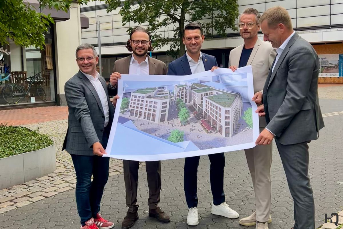 Im Hintergrund: Das alte Kaufhaus. Im Vordergrund: OB Marc Herter, Simon Schneider, Franz Venker (Green Roof), Architekt Volker Pahmeyer und Baudezernent Andreas Mentz (von links) mit den neuen Visualisierungen vom Heinemann Quartier.