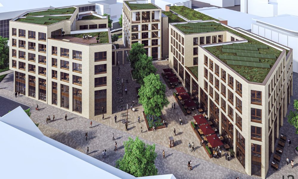 Sie zeigen, wie sich das ehemalige Kaufhof-Areal zu einem modernen, nachhaltigen und lebendigen Stadtquartier entwickeln wird: mit markanter Architektur, einem grünen Quartiersplatz, flexiblen Büro- und Praxisflächen, Gastronomie und zeitgemäßen Wohnangeboten.