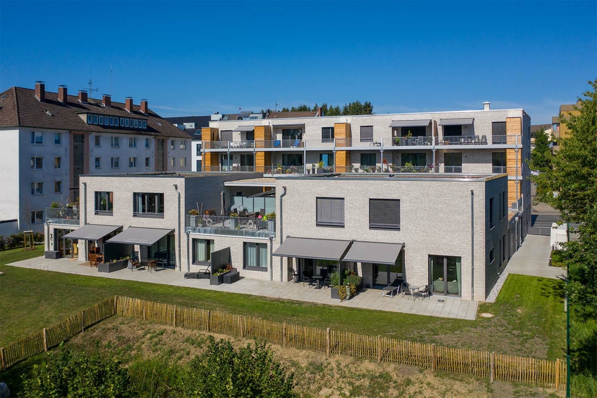 Das Projekt besteht aus zwei parallel angeordneten Baukörpern mit insgesamt 21 barrierearmen Wohnungen und einer gemeinsamen Tiefgarage. Auf Wunsch unseres Investors konnten wir in dem höheren – zur Straße orientierten – Gebäude im Erdgeschoss eine Besonderheit planen und umsetzen: Hier befinden sich ein buchbarer Gemeinschaftsraum und zwei separate Gästewohnungen für Besucher von Mietern, eine soziale Komponente, deren Qualität sich besonders positiv auf das Miteinander im Wohnprojekt auswirkt. Der zweite und niedrigere Baukörper im Gartenbereich, knüpft mit üppigen Terrassen bzw. Dachterrassen im Erd- und Obergeschoss an den besonderen Wohnkomfort an.