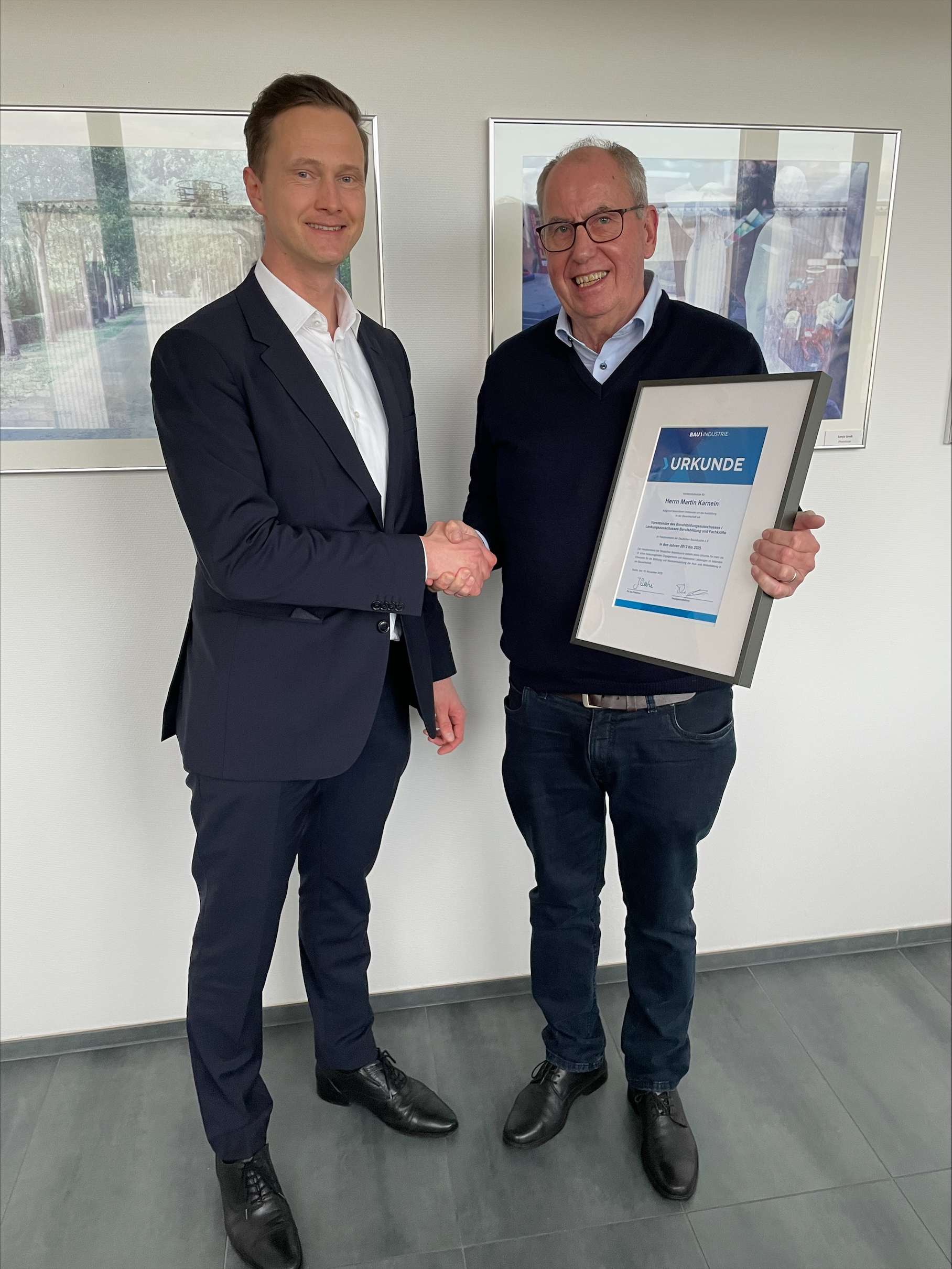 Nach 13 Jahren im Amt leitete der Bauunternehmer Martin Karnein die Sitzung zum letzten Mal. Der Ausschuss dankte ihm und würdigte sein langjähriges Engagement für die Aus- und Weiterbildung in der Deutschen Bauindustrie mit einer Ehrenurkunde.